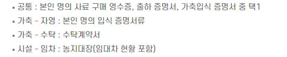 - 농업경영체등록신청서, 축산업허가증, 증빙자료